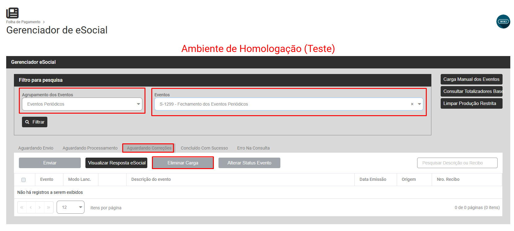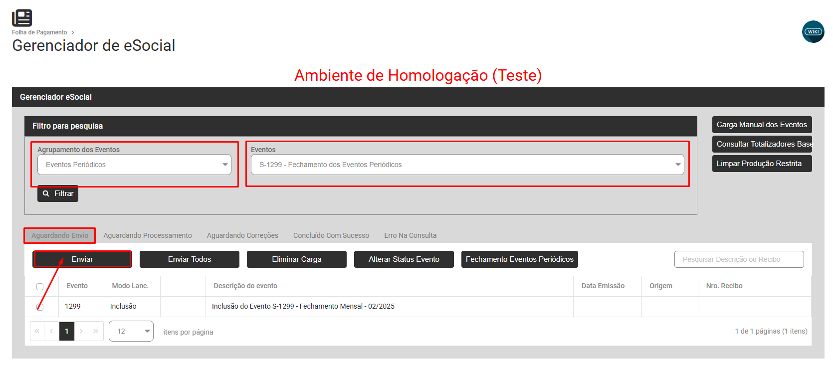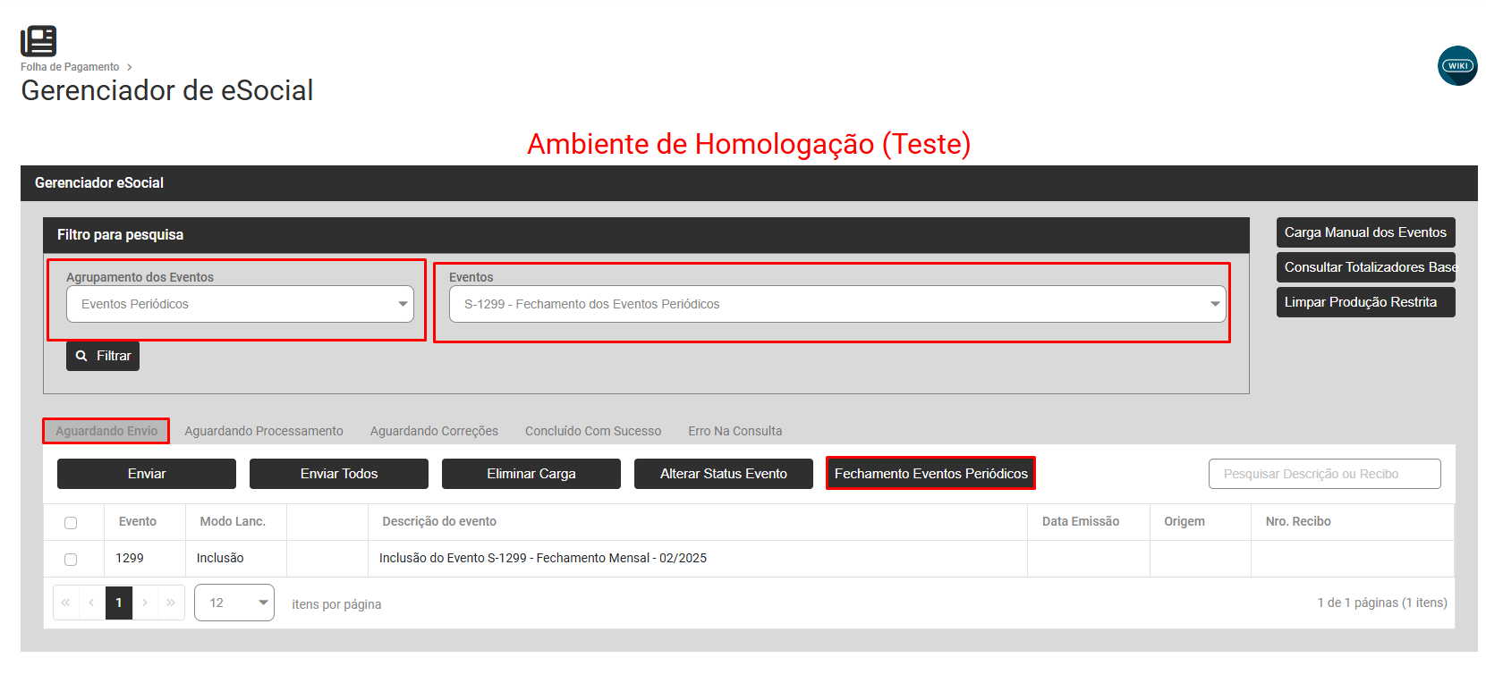 Faça novamente a geração da carga S1299, acessando a aba Aguardando Envio e clicando no botão Fechamento dos Eventos Periódicos