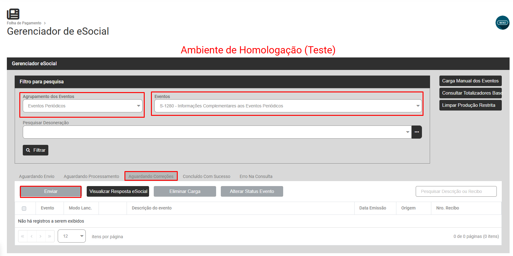 Filtre por Eventos Periódicos - S1280, Aguardando Correção e faça novamente o envio do evento para o Portal do eSocial