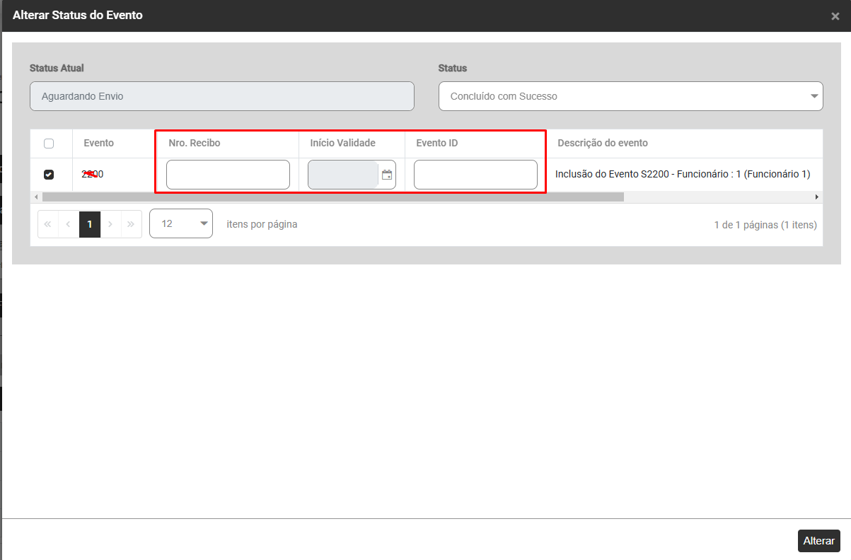 Agora, cole o número do recibo que se encontra cadastrado no Portal do eSocial e clique em Alterar