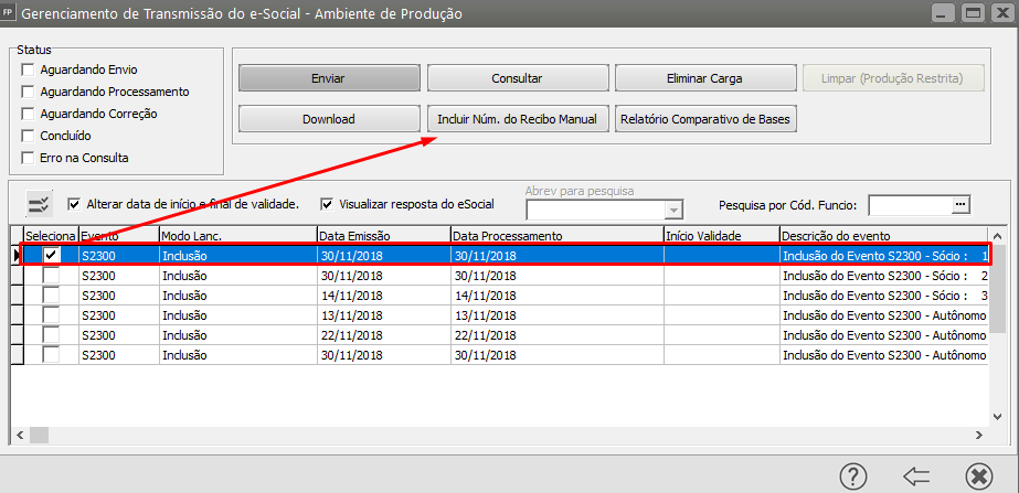 Nesse caso, acesse o Portal do eSocial e pesquise pelo Sócio/Autônomo, copie o recibo e em seguida acesse o Gerenciamento de Transmissão do eSocial, pesquise por Eventos Não Periódicos S2300 e clique na seta Avança