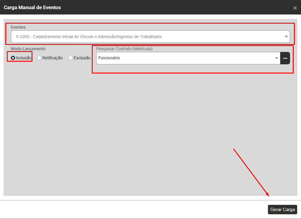 Defina evento S2200, Modo de Lançamento Inclusão e em seguida defina o Contrato do trabalhador, clique em Gerar Carga