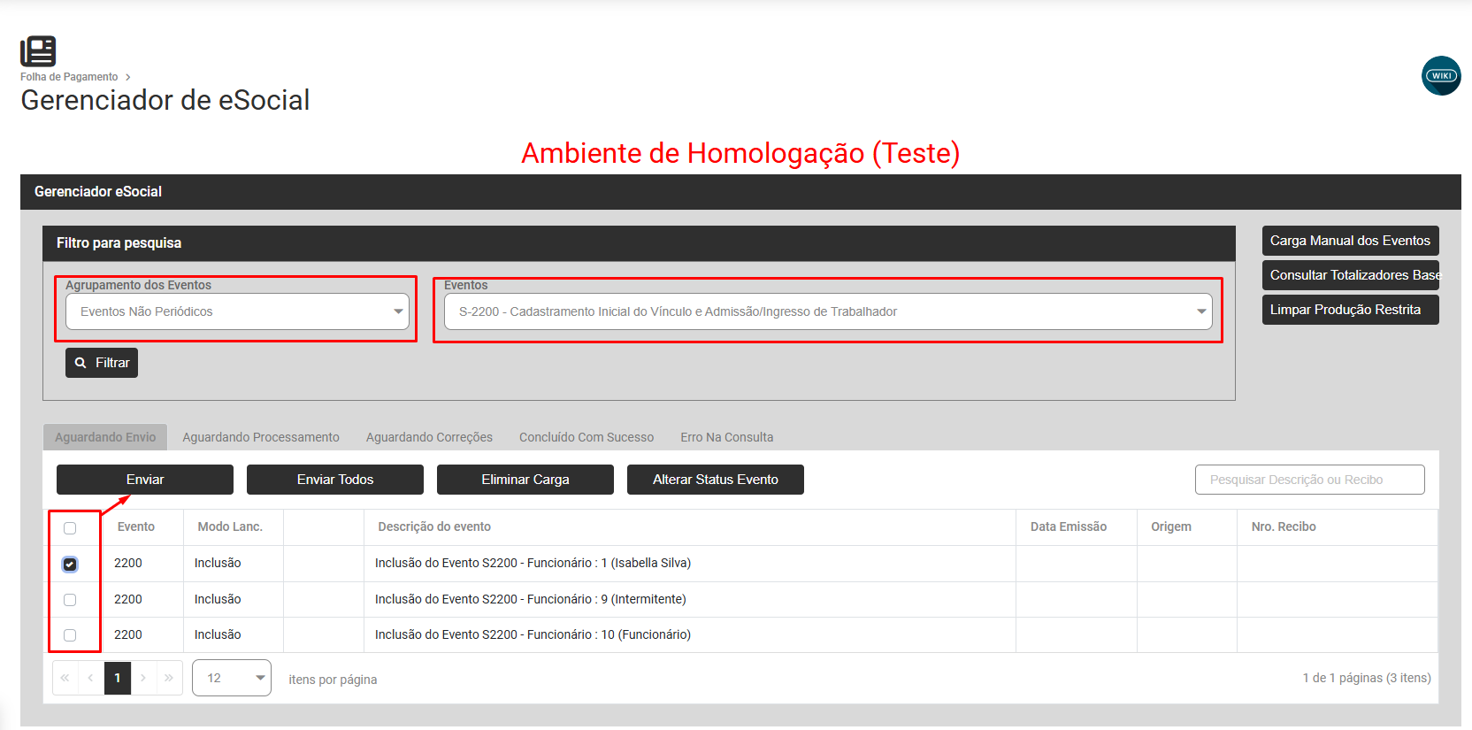 Agora, filtre por Eventos Não Periódicos S2200 - Aguardando Envio, selecione o contrato que deverá ser enviado para o Portal do eSocial e clique em Enviar