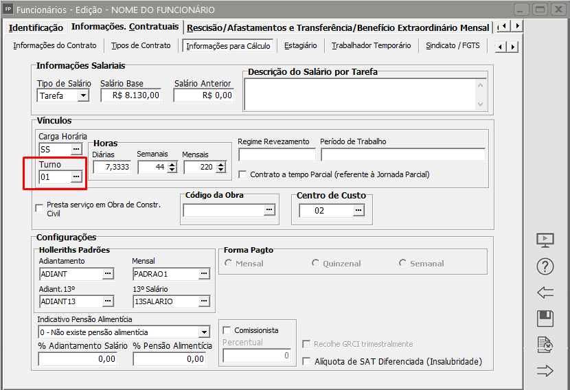 Manutenção > Funcionários > Manutenção de Funcionários > Manutenção - aba Informações Contratuais > Informações para Calculo - campo turno