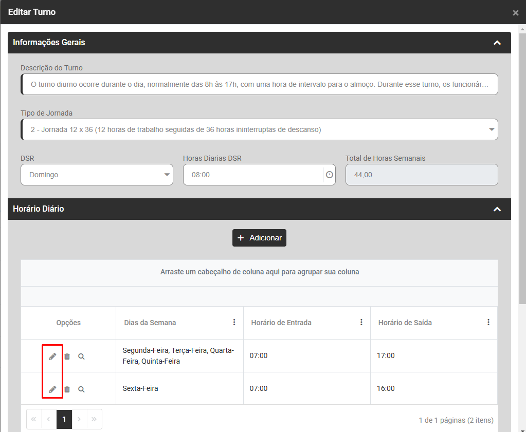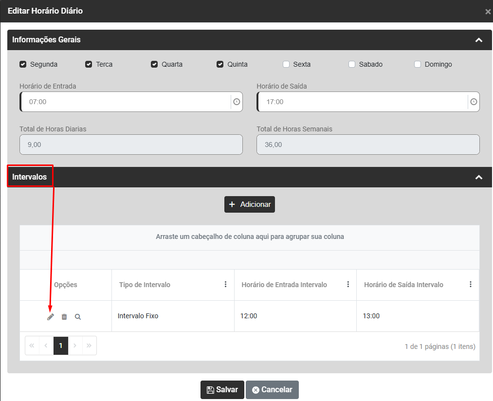 Edite o cadastro que apresentou a inconsistência e em seguida edite o cadastro realizado no campo Horário Diário
