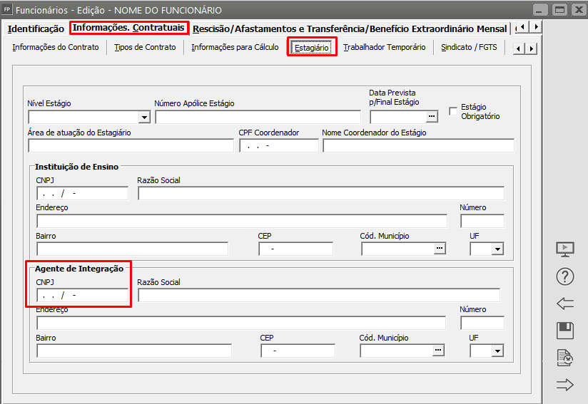 Edite o cadastro do Trabalhador e acesse a aba Informações Contratuais, sub aba Estagiário e confira a informação cadastrada no campo CNPJ do Agente de Integração, se foi digitado corretamente e consulte esse CNPJ na receita federal para verificar se está OK.