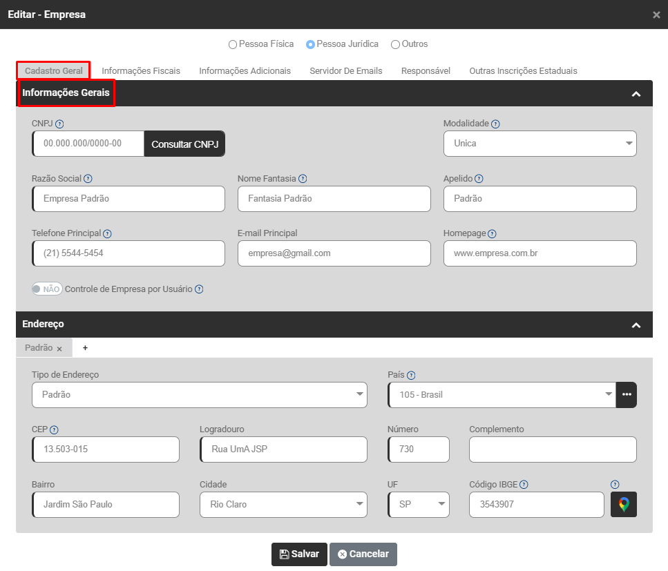 Edite a Empresa que apresentou a inconsistência na aba Cadastro Geral>Informações Gerais