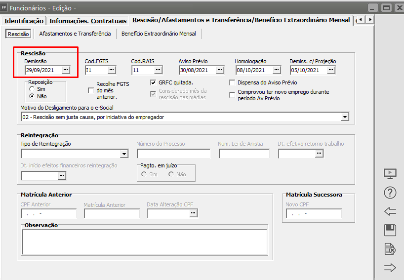 Editar o cadastro do funcionário e acessar a aba Rescisão/Afastamentos e Transferência/Benefício Extraordinário Mensal sub aba Rescisão e verificar a data informada no campo Rescisão.
