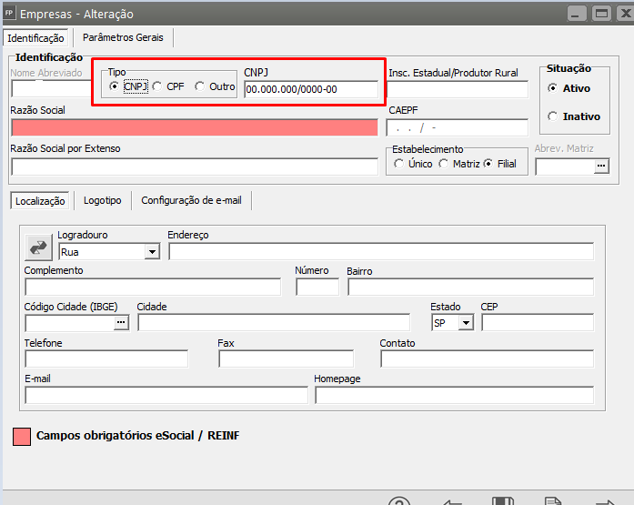 Correção: Acesse o menu Manutenção > Empresas > Dados Cadastrais > Manutenção