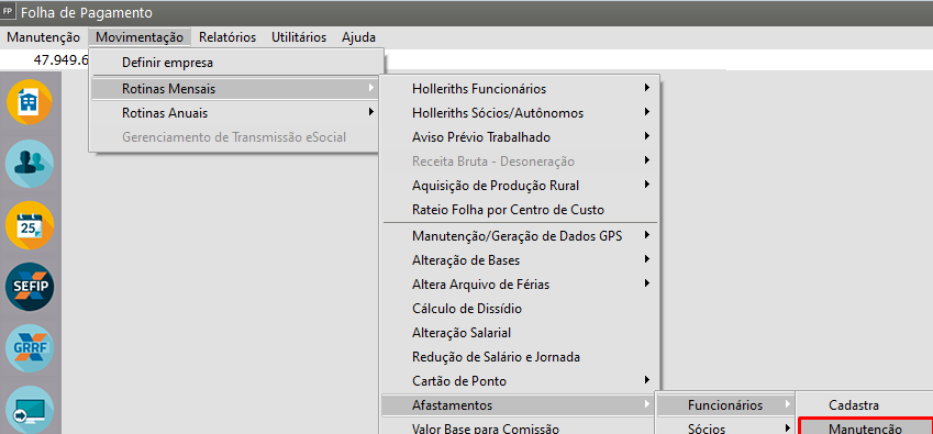 Correção: Acesse o Menu Movimentação > Rotinas Mensais > Afastamentos > Manutenção