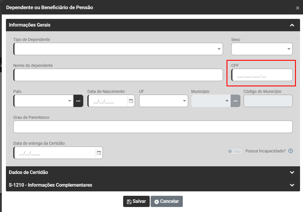 - O CPJ do Trabalhador não pode ser informado no campo CPF do Dependente