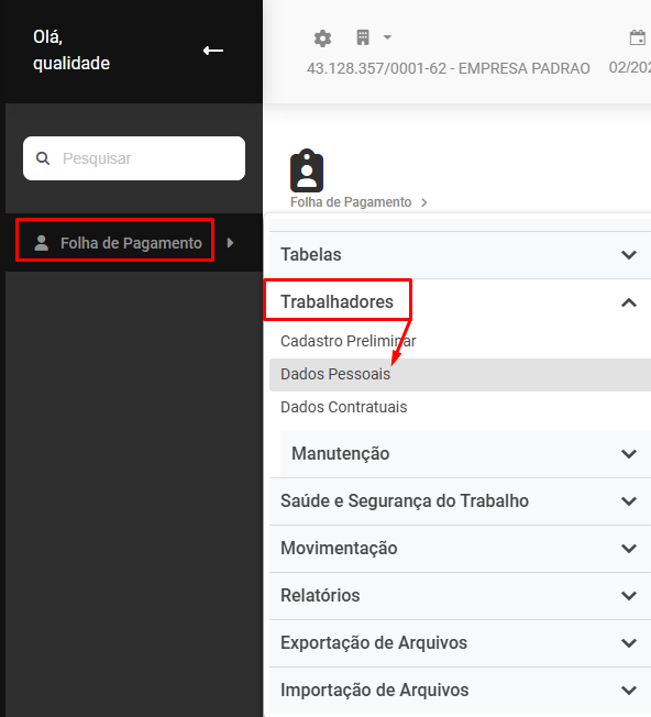 Correção: Acesse o menu Folha de Pagamento>Trabalhadores>Dados Pessoais