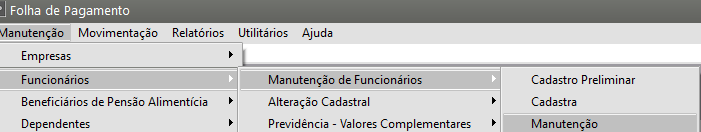 Correção: Acesse o menu Manutenção > Funcionários > Manutenção de Funcionários > Manutenção