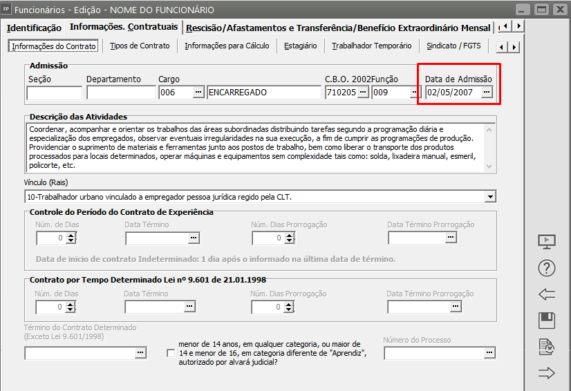 Ação Sugerida: Conferência da Data de Admissão do funcionário
