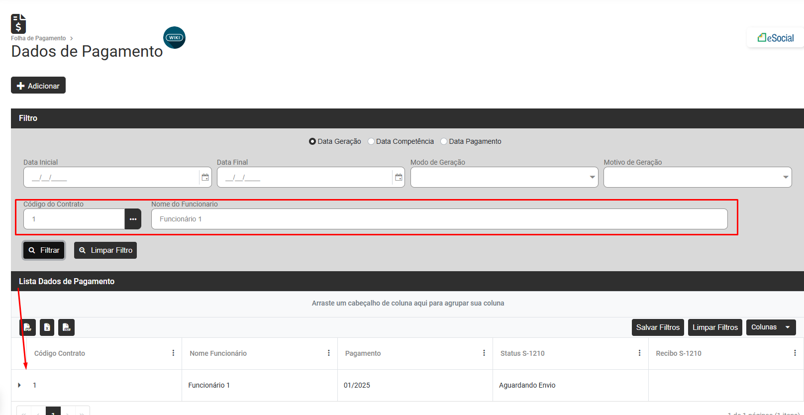 Filtre pelo Contrato do Trabalhador e verifique a Lista de Dados de Pagamento