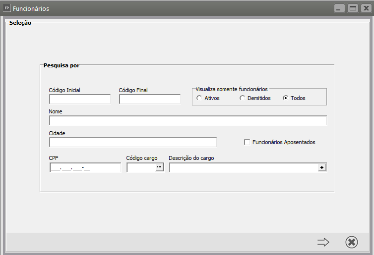 Correção: Acesse o menu Manutenção > Funcionários > Manutenção de Funcionários > Manutenção, pesquise pelo Código do Funcionário e clique na seta Avança