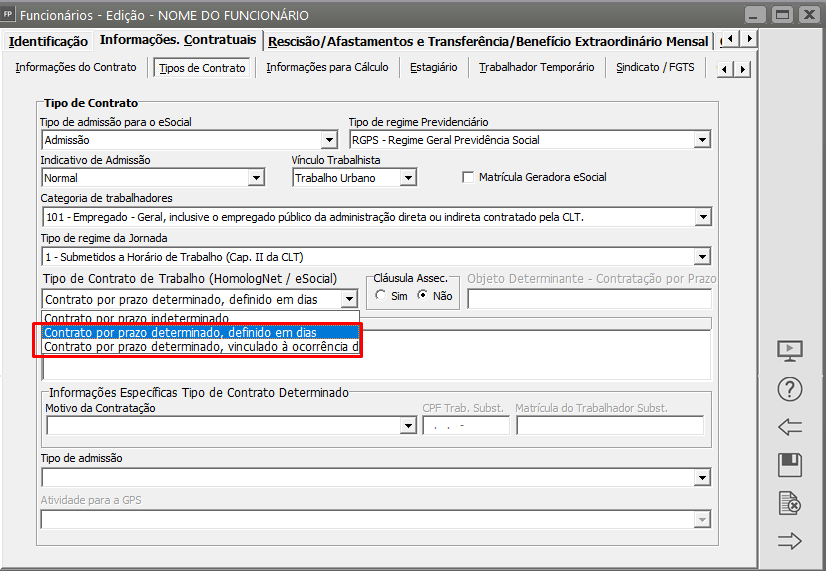 Edite o cadastro do funcionário e acesse a aba Informações Contratuais > Tipos de Contrato e verifique se o contrato informado para o Trabalhador é por Prazo Determinado