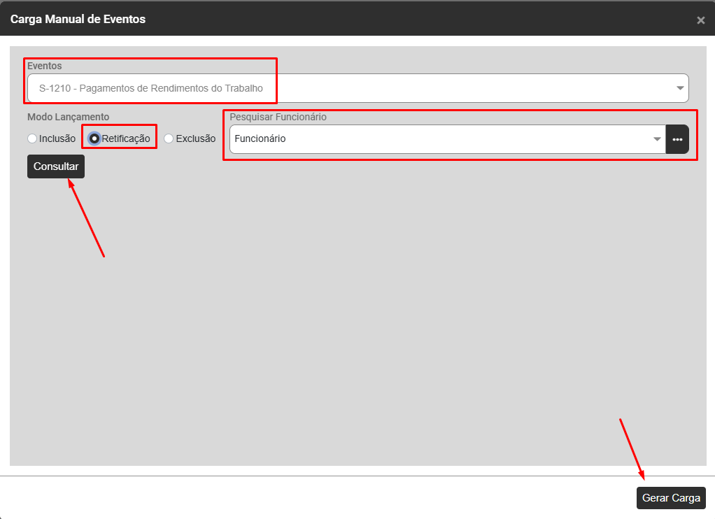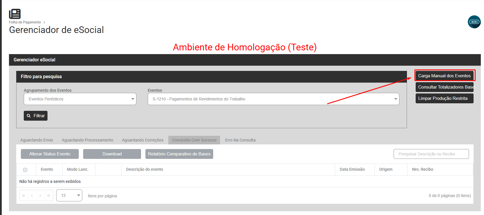 Para gerar a carga do evento de retificação, acesse o botão Carga Manual dos Eventos