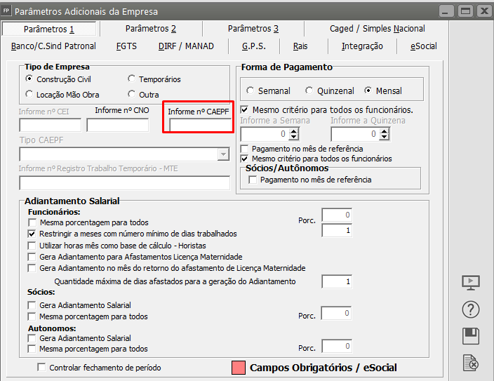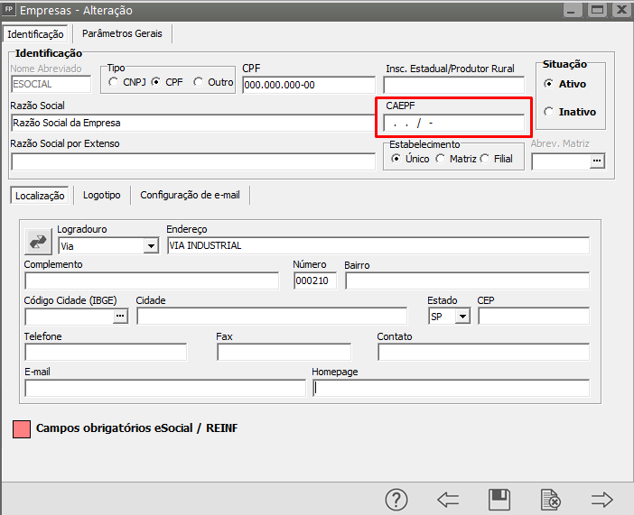 Acesse o Menu Manutenção > Empresas > Parâmetros Adicionais da Empresa e confirme o número do CAEPF
