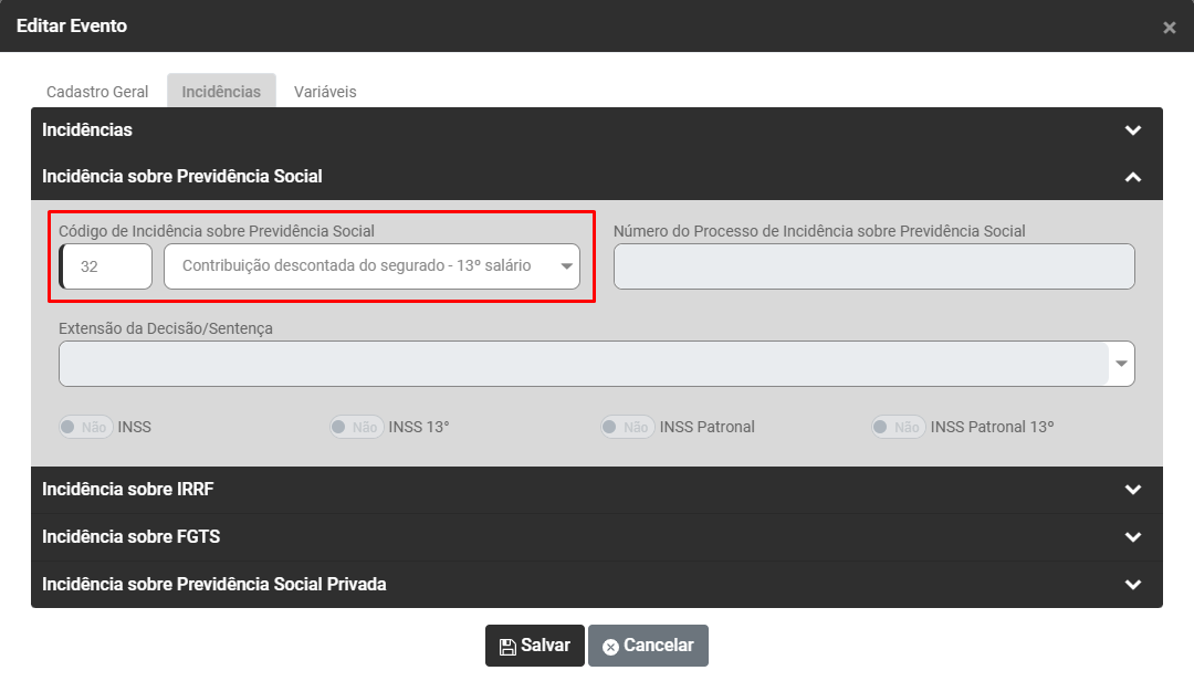 Na Geração das informações não deve haver nenhum evento cujo Código de Incidência sobre Previdência Social seja 31 ou 32