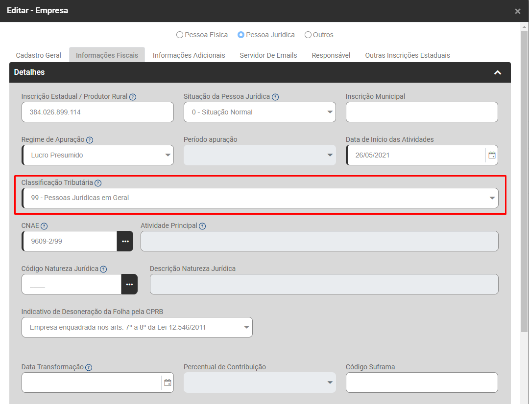 Edite a Empresa que apresentou a inconsistência e acesse a aba Informações Fiscais>Campo Classificação Tributária