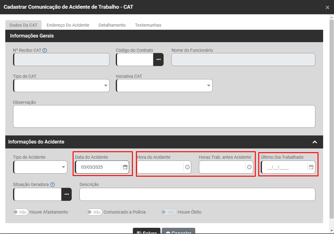 Edite a CAT do Trabalhador que apresentou a inconsistência e confira na aba Dados da CAT>Informações Gerais - Campo Data do Acidente, Hora do Acidente, Horas Trabalhadas Antes do Acidente e Último Dia Trabalhado