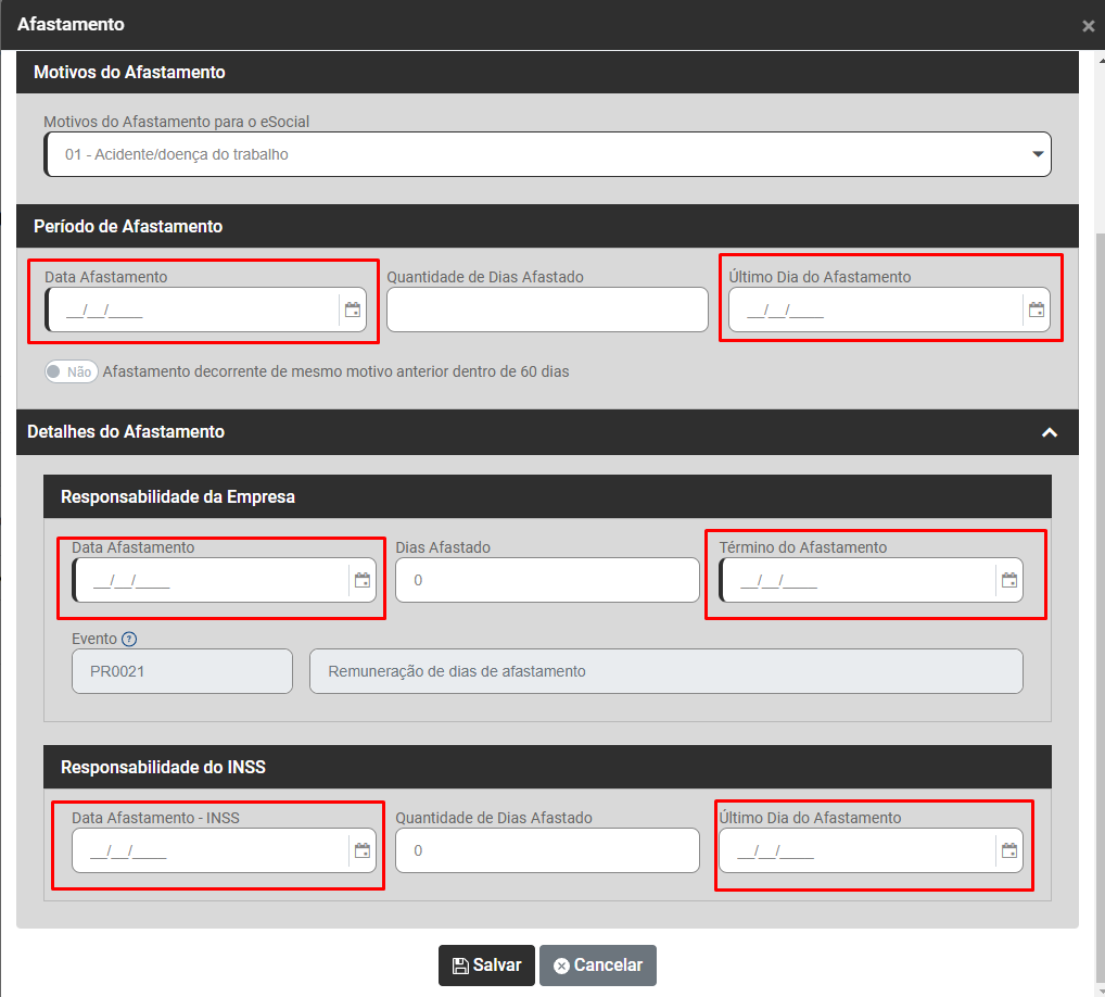 Ação Sugerida: Deve ser uma data igual ou posterior a data do afastamento que está sendo alterado e menor que a data de término do afastamento, caso esta já tenha sido informada.