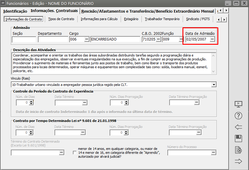 Correção: Acesse o menu Manutenção > Funcionários > Manutenção de Funcionários > Manutenção, aba