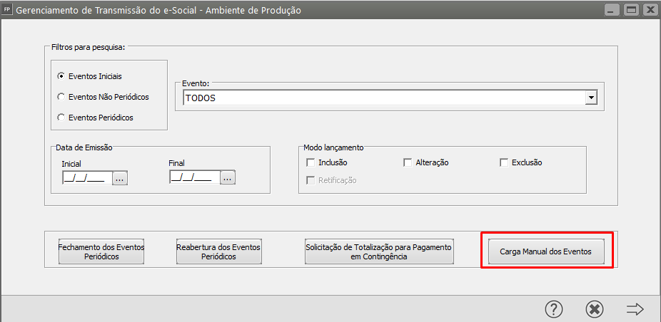 Elimine a carga de retificação que foi rejeitada pelo eSocial e em seguida acesse o Gerenciamento de Transmissão do eSocial, clique no botão Carga Manual dos Eventos