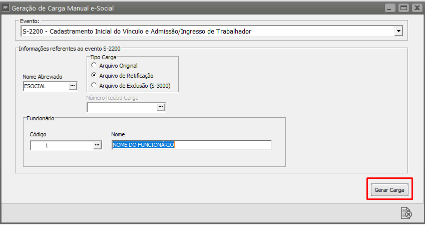 Defina o evento S2200, selecione Tipo de Carga Arquivo de Retificação, defina o funcionário e gere a carga