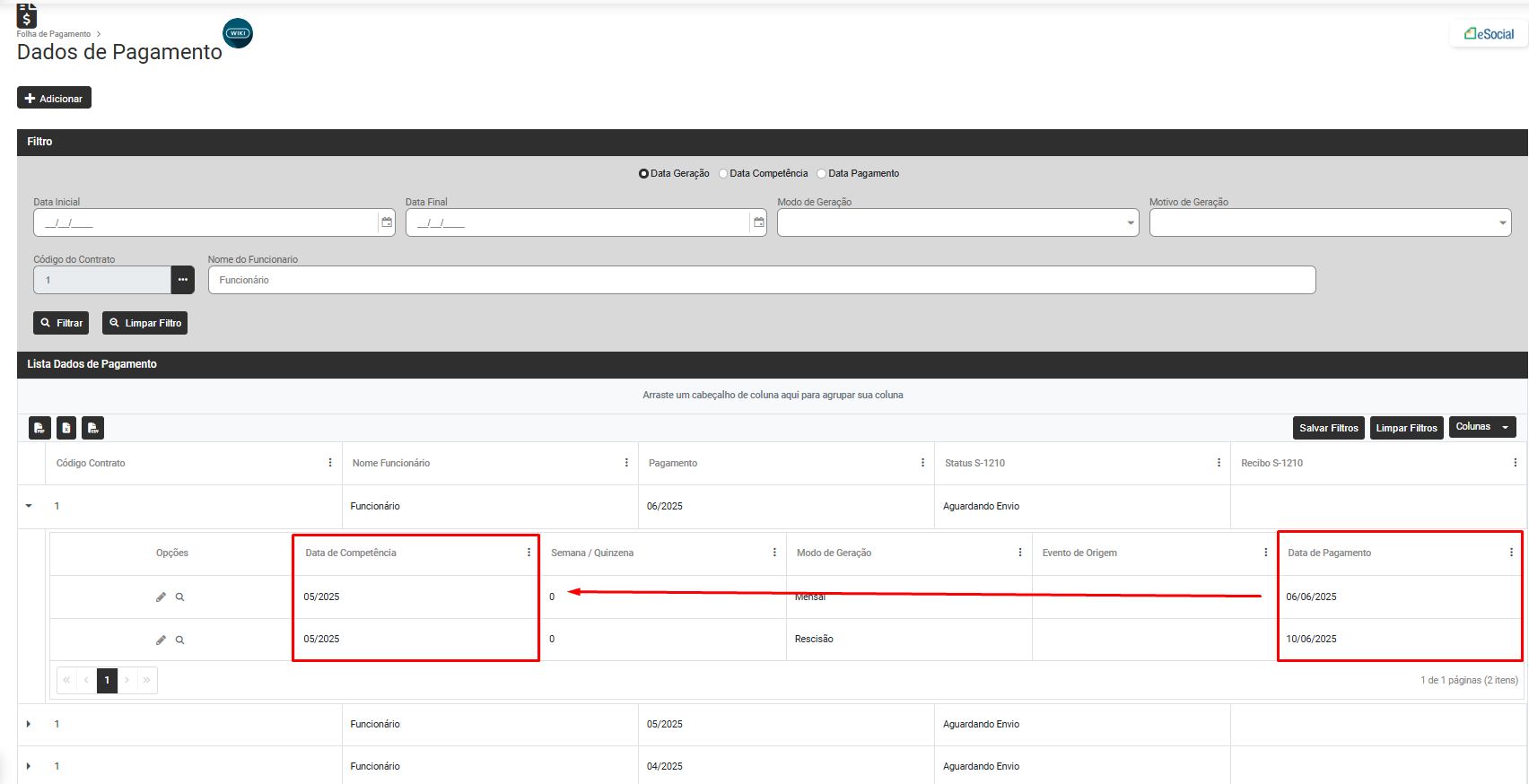 Pesquise pelo Trabalhador e em seguida verifique se as datas de Mês e Ano de Competência são anteriores as Datas de Pagamento