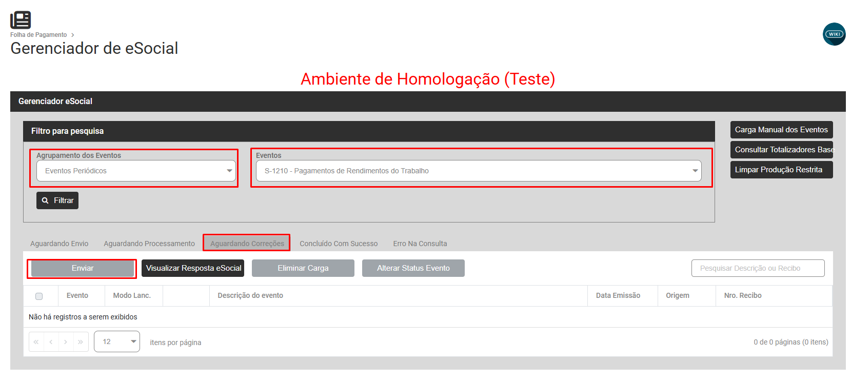 Filtre por Eventos Periódicos, S1210 - Aguardando Correção selecione o evento que apresentou a inconsistência e faça novamente o envio para o Portal do eSocial