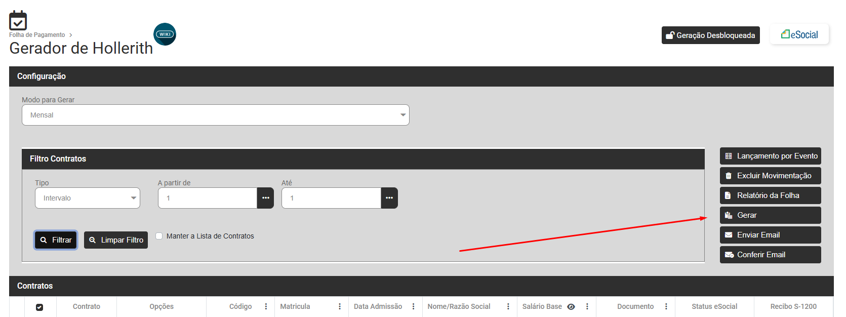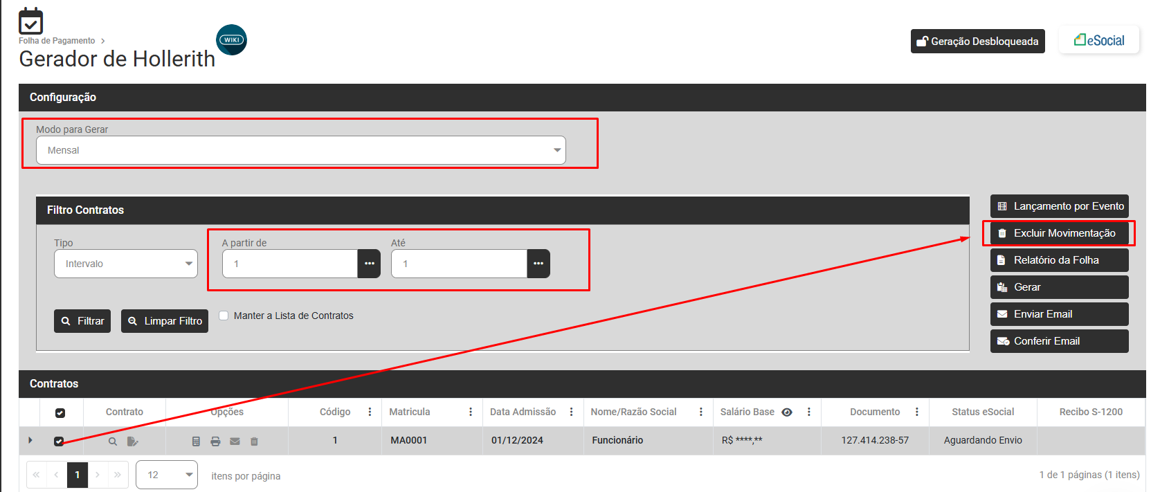 Em seguida filtre pelo funcionário que apresentou a inconsistência, selecione a geração e em seguida clique em Excluir Movimentação