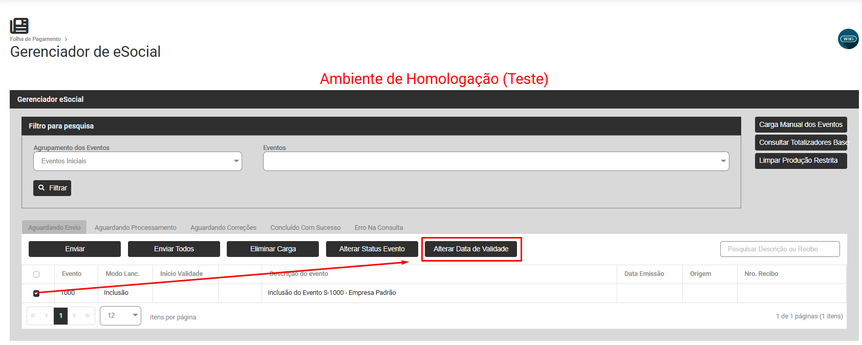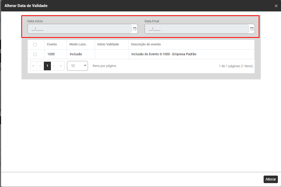 Filtre por Eventos Inicias S1000, defina o evento que será enviado para o Portal do eSocial e clique em ALTERAR DATA DE VALIDADE
