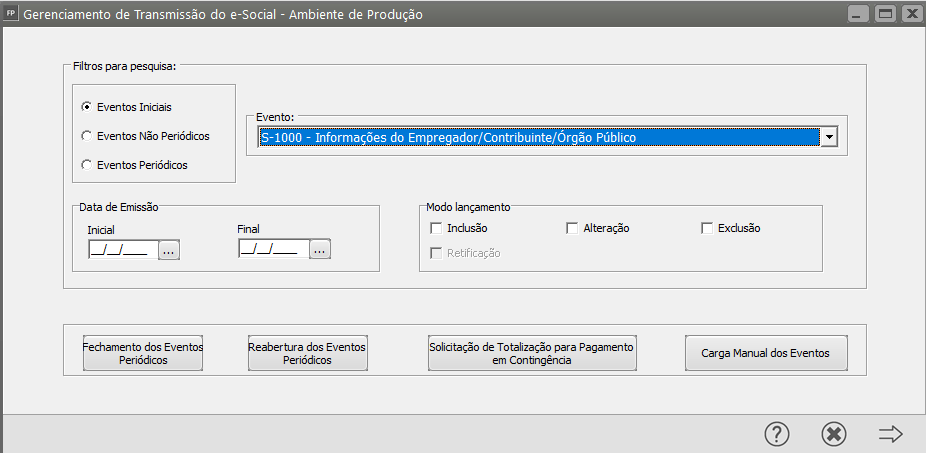Correção: Acesse o Gerenciamento de Transmissão do eSocial e filtre por Eventos Iniciais S1000 e clique na seta Avança.