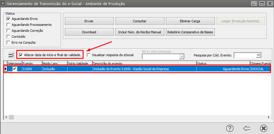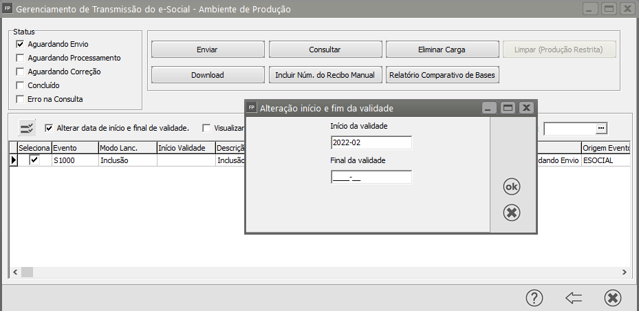 Faça o envio para o Portal do eSocial clicando na opção ALTERA DATA DE INÍCICO E FINAL DE VALIDADE