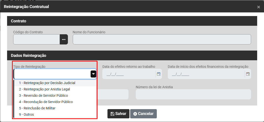 Confirme a informação cadastrada no campo Tipo de Reintegração