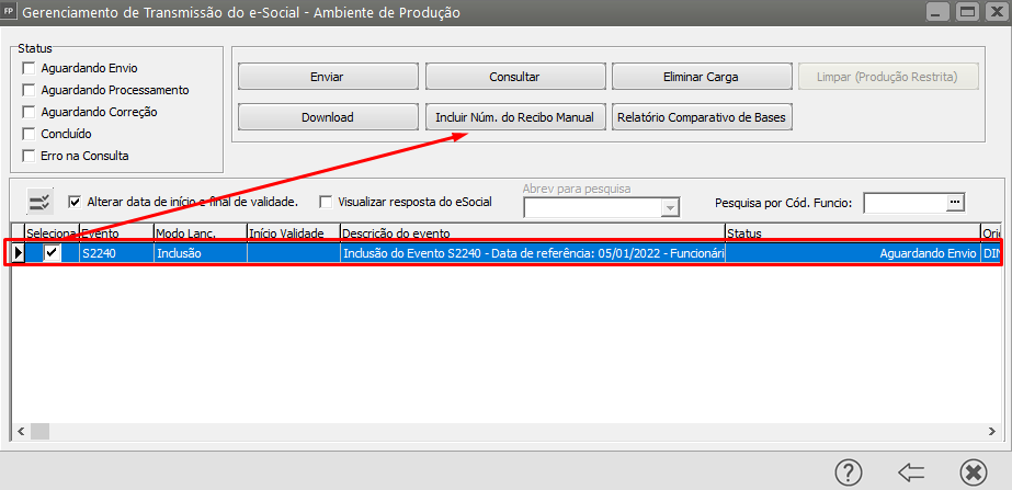 Selecione a informação que você tentou enviar mas que já se encontra no Portal do eSocial, em seguida clique em Incluir Número de Recibo Manual