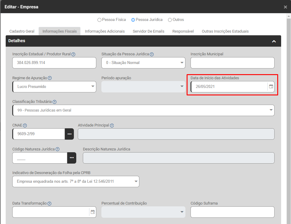 Na aba Informações Fiscais>Detalhes, confira a data informada no campo Data de Início das Atividades