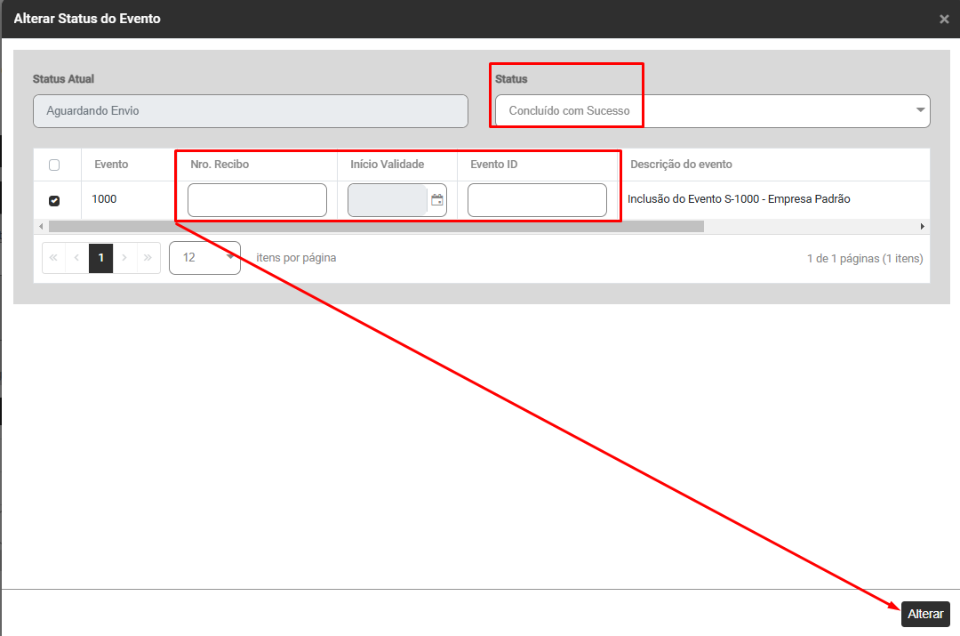 Será apresentada a tela para que você Altere o Status do Evento, mude para Status Concluído com Sucesso e cole o número do recibo que foi copiado do Portal do eSocial, informe a data de Início da Validade e o Evento ID
