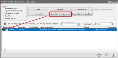 Em seguida acesse o Gerenciamento de Transmissão do eSocial, filtre o evento S1000 e clique em incluir número do recibo manual