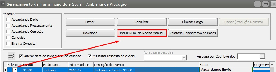 Em seguida, acesse o Gerenciamento de Transmissão do eSocial, filtre o evento S1000 e clique em incluir o número do manual de recebimento