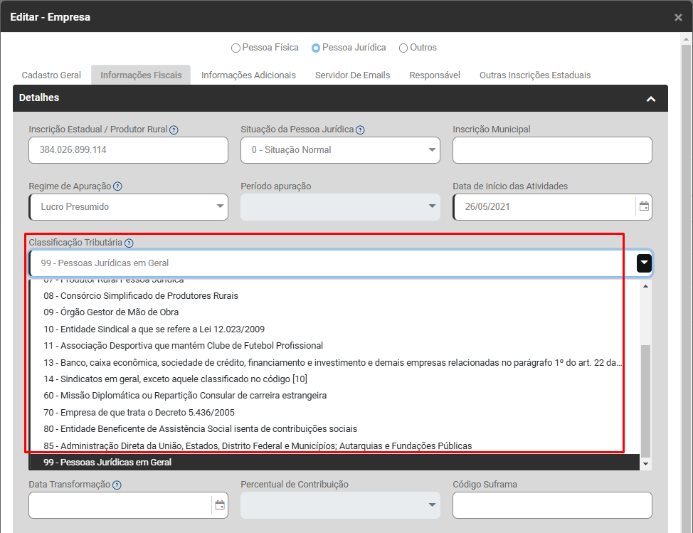 Confira a Classificação Tributária informada no campo Classificação Tributária