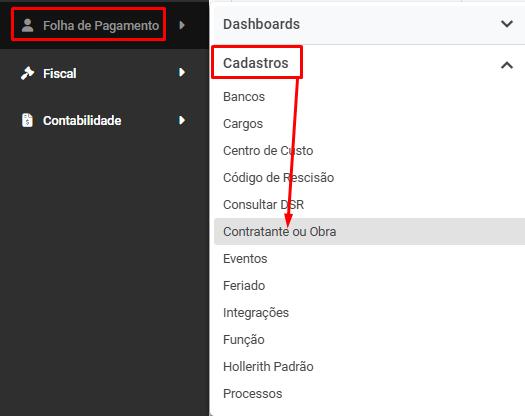 Se a empresa for Construção Civil, acesse Folha de Pagamento>Cadastros>Contratantes ou Obras