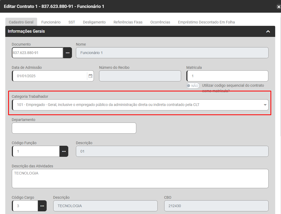 Edite os Dados Contratuais do Trabalhador que apresentou a inconsistência, na aba Cadastro Geral>Informações Gerais - Campo Categoria do Trabalhador