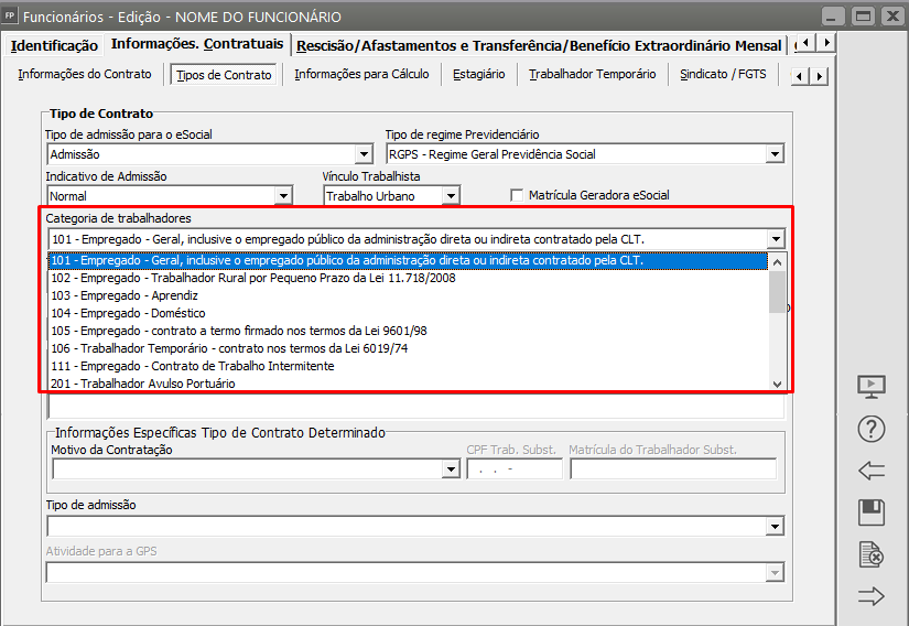 Se a informação do campo Categoria de Trabalhadores enviada anteriormente para o Portal do eSocial for [102, 105, 106] ela poderá ser alterada apenas para [101].