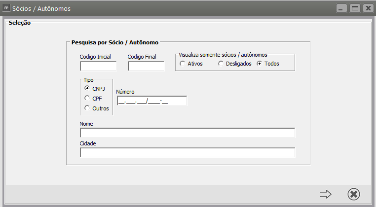 Correção: Acesse o menu Manutenção > Sócios/Autônomos > Manutenção, pesquise pelo código e clique na seta Avança