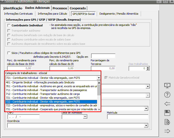 Em seguida acesse a aba Dados Adicionais, sub aba GPS/SEFIP/eSocial e verifique a informação do campo Categoria de Trabalhadores - eSocial