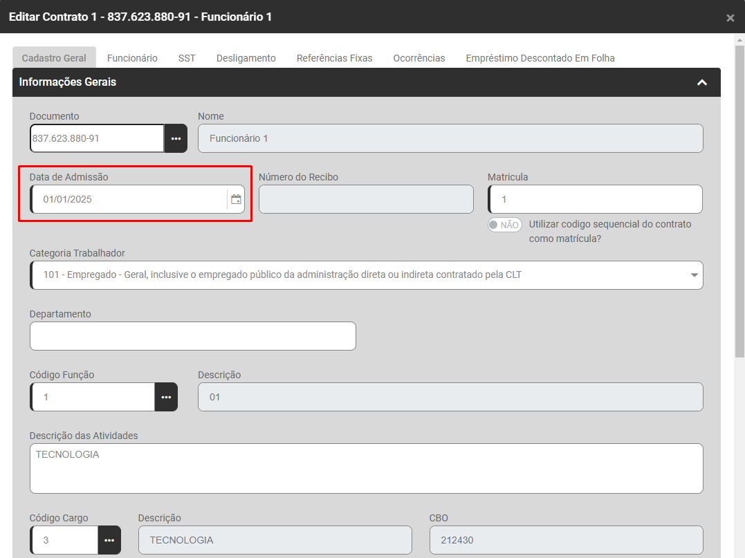 Edite os Dados Contratuais do Trabalhador que apresentou a inconsistência, na aba Cadastro Geral>Informações Gerais e confira a informação do campo Data de Admissão