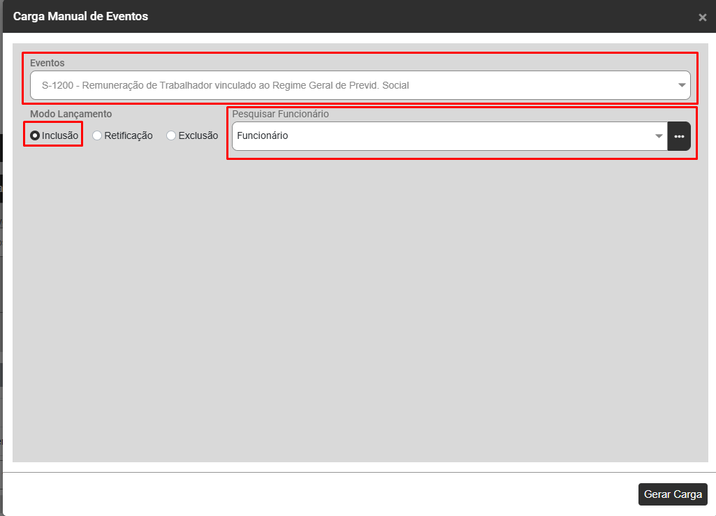 Defina o evento S1200, Modo de Lançamento e o trabalhador e clique em Gerar Carga