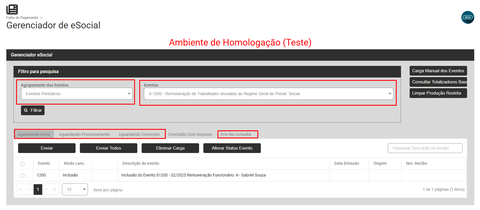 Filtre por Eventos Periódicos S1200 e verifique se existe evento nas abas Aguardando Envio, Aguardando Processamento, Aguardando Correção ou Erro de Consulta